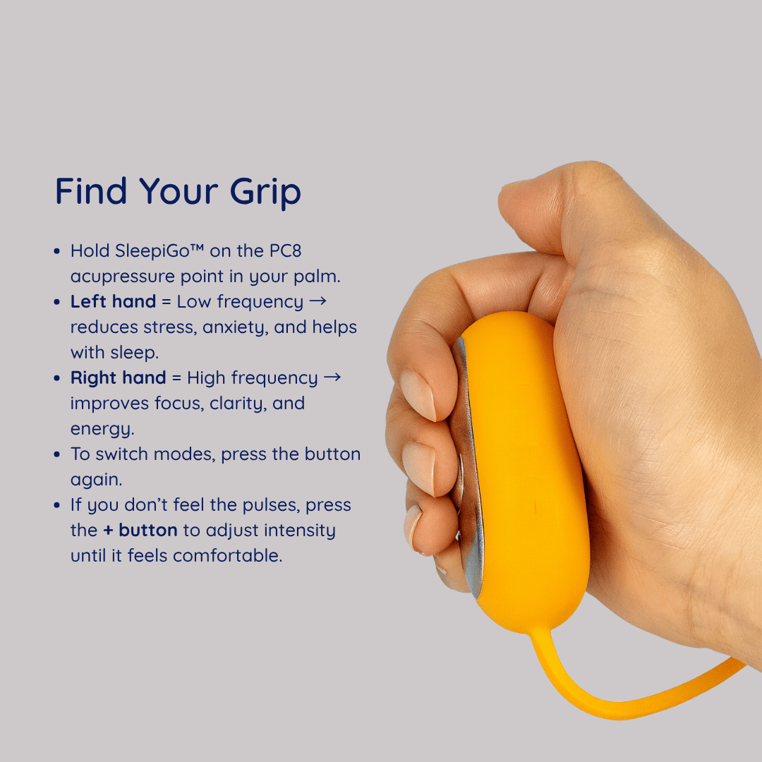 SleepiGo™ uses Pressure Point Therapy Technology (PPTT) — a combination of low-frequency microcurrents and acupressure — to activate your body’s natural relaxation response. By stimulating the PC8 acupressure point in your palm, it helps: