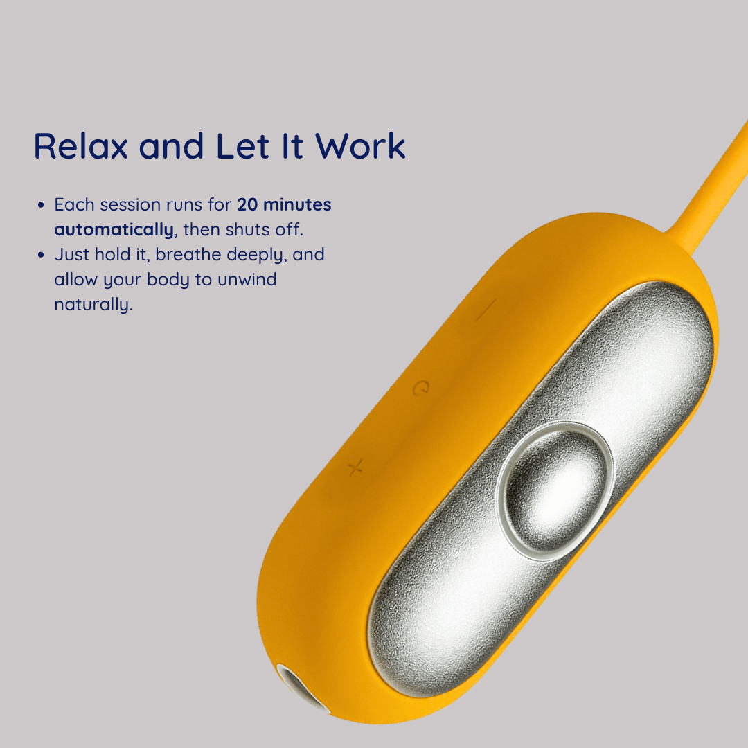 Each session lasts 20 minutes automatically thanks to the built-in timer. There’s no strict limit on daily use, but the best results usually come with consistent use — making SleepiGo™ part of your daily routine rather than only in stressful moments.
