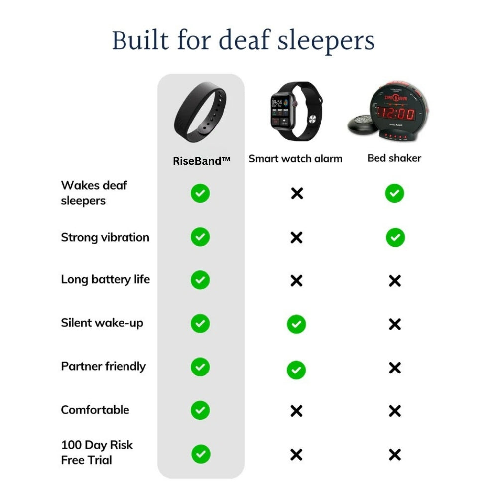 RiseBand™ is engineered with powerful high-torque vibrations strong enough to wake even the heaviest sleepers — with zero reliance on sound. A reliable, dignified wake-up solution built with the deaf and hard-of-hearing community in mind.